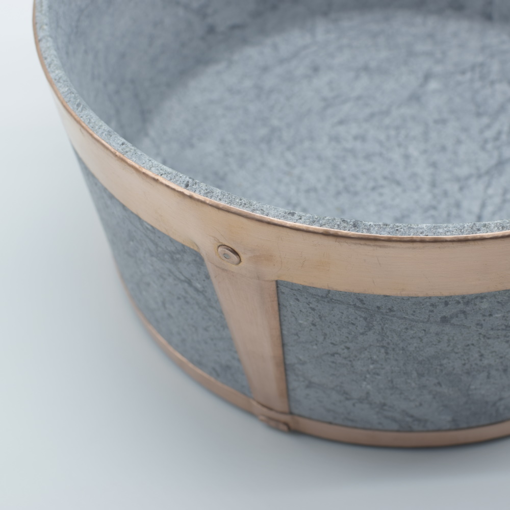 Pentola in pietra ollare, chiamata Lavec, rilegata in rame. Ogni pezzo viene realizzato a mano dall’artigiano. Sono pentole naturali perchè non vengono usati né smalti, né vernici durante le fasi di produzione.