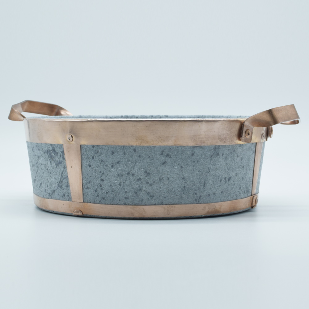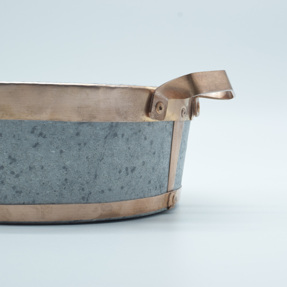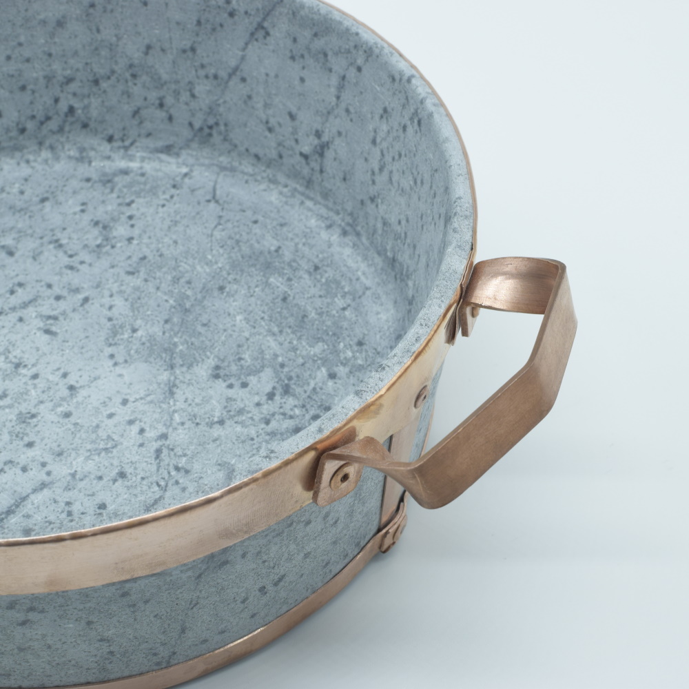 Pentola in pietra ollare, chiamata Lavec, rilegata in rame. Ogni pezzo viene realizzato a mano dall’artigiano. Sono pentole naturali perchè non vengono usati né smalti, né vernici durante le fasi di produzione.