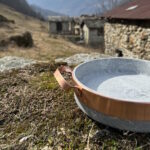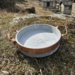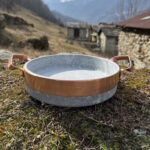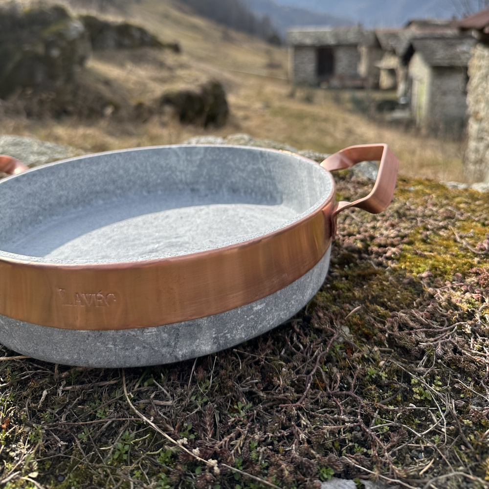 Pentola in pietra ollare, chiamata Lavec, rilegata in rame. Ogni pezzo viene realizzato a mano dall’artigiano. Sono pentole naturali perchè non vengono usati né smalti, né vernici durante le fasi di produzione.