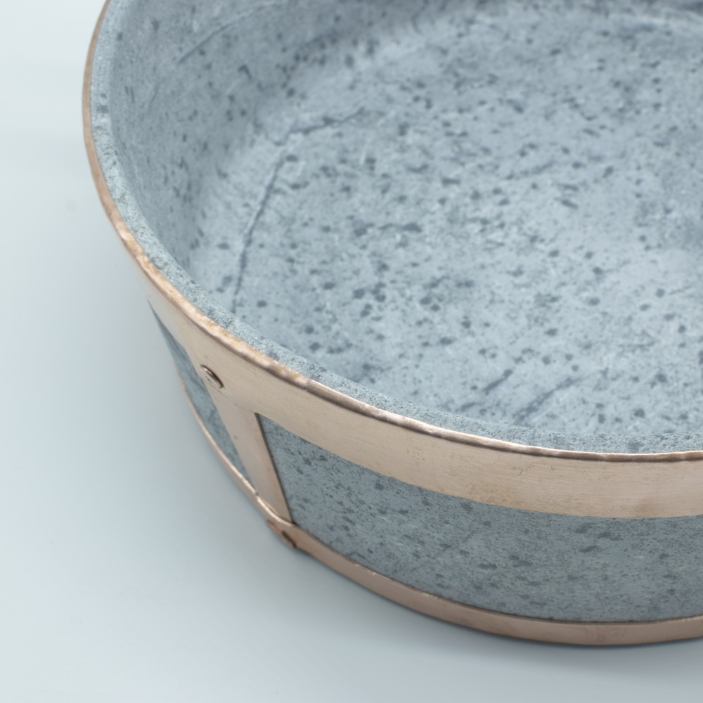 Pentola in pietra ollare, chiamata Lavec, rilegata in rame. Ogni pezzo viene realizzato a mano dall’artigiano. Sono pentole naturali perchè non vengono usati né smalti, né vernici durante le fasi di produzione.