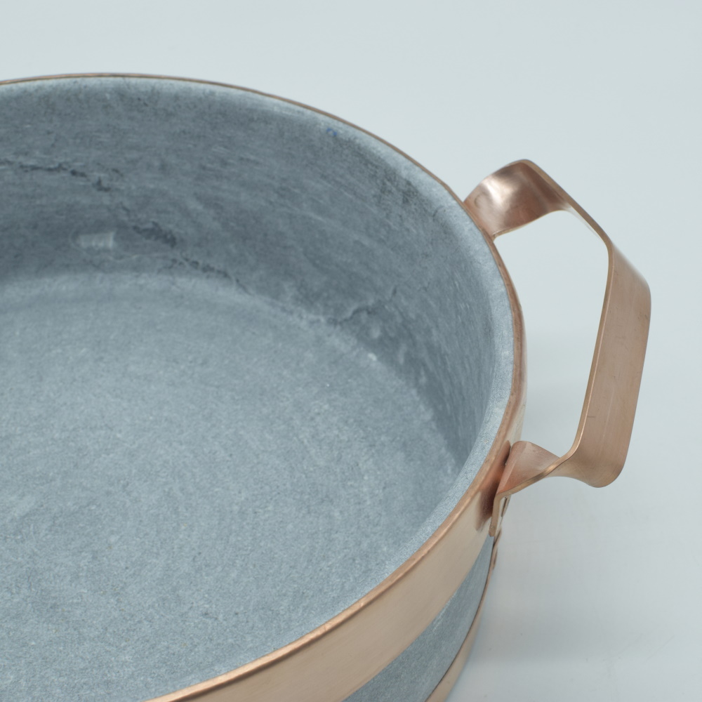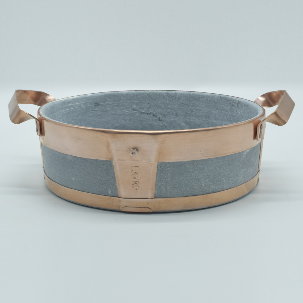 Pentola in pietra ollare, chiamata Lavec, rilegata in rame. Ogni pezzo viene realizzato a mano dall’artigiano. Sono pentole naturali perchè non vengono usati né smalti, né vernici durante le fasi di produzione.