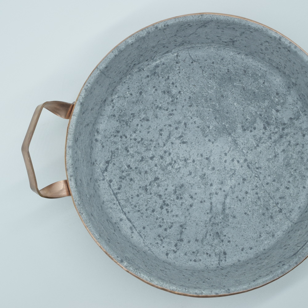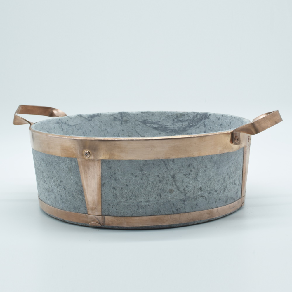 Pentola in pietra ollare, chiamata Lavec, rilegata in rame. Ogni pezzo viene realizzato a mano dall’artigiano. Sono pentole naturali perchè non vengono usati né smalti, né vernici durante le fasi di produzione.